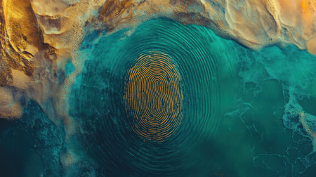 This stunning aerial image showcases an abstract fingerprint pattern elegantly formed on a water surface, blending vibrant colors and intricate textures, creating a captivating visual experience.
