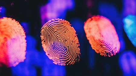 Fingerprint security scanning on a digital interface. Biometric prints. Bright colors.