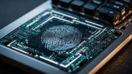 Close-up view of a fingerprint sensor embedded in a circuit board highlighting technology and security
