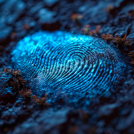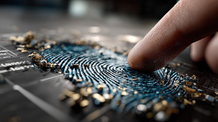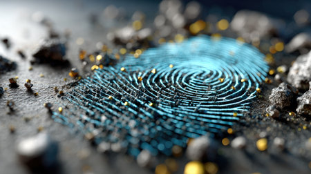 This striking image features a detailed blue fingerprint imprint set against a textured surface scattered with metallic particles. The design captures the essence of identity and security, perfect for various creative projects.