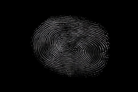 A close up of a fingerprint on a black surface. Concept of mystery and intrigue, as the fingerprint is the only visible mark on the otherwise dark and empty background