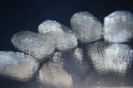 Illuminated fingerprint on glass surface in close up macro shot