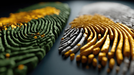 This captivating image showcases vibrant fingerprint patterns in yellow, green, and gray on a dark background, highlighting intricate details and textures.