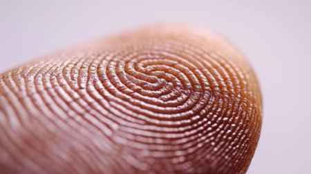 Fingerprint showing the unique dermal ridges of a human finger, representing personal identification, biometrics, security, crime evidence, and individual privacy