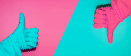 Thumbs-up and thumbs-down signs. Hand gesture of agreement and disagreement. Positive and negative answer. Usage of protective glove to prevent infection.
