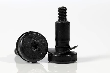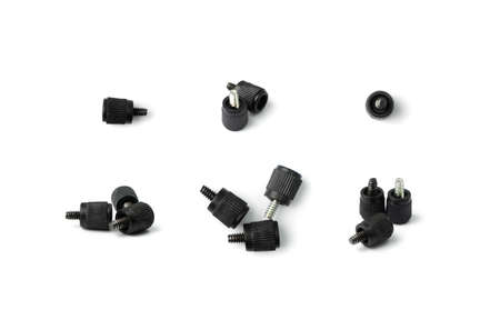 Black computer bolts isolated. Heap of small bolts, screws and nuts on white background