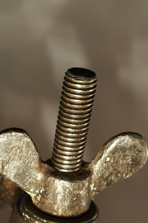Close-up of a metallic bolt with a threaded shaft and hexagonal nut on a neutral background.