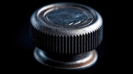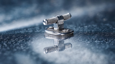 A close-up image showcasing a metal bolt fastener positioned on a reflective surface, emphasizing its details and industrial charm.