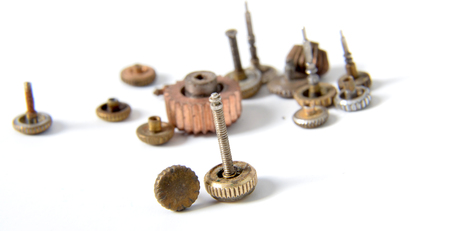 Cogs for assembling a computer, photographed close-up with a blurred background.