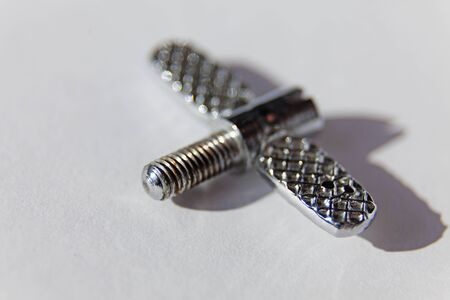 Pile of shoulder thumb screws with combined flat and cross recessed head, white and blue corrosion coating, top view close-up in selective focus
