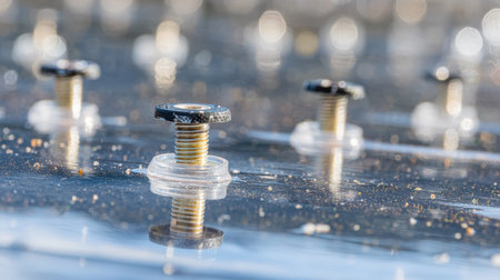 A detailed close-up image showcasing metal bolts on a shiny surface, featuring a blurred background creating a pleasing bokeh effect, emphasizing modern industrial beauty.