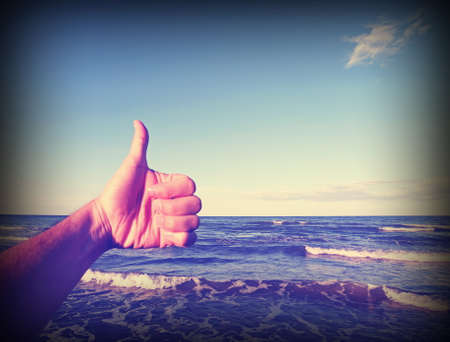 Female hand thumbs up on sea and sky background closeup. Woman showing ok sign on shoreline coastline. Body language, communication concept. Holiday, vacation, summer is coming conceptual photo.