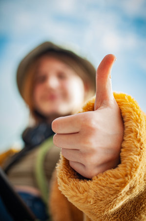 Young girl puts her big thumbs up. Portrait of cheerful kid. Smiling girl having fun outside. Happy successful person.