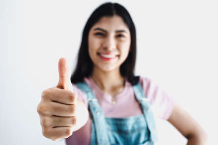young latin woman smiling and showing thumbs up on a white background in Latin America