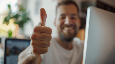 Cheerful young businessman giving a thumbs up in a modern office setting, showing approval and positivity.