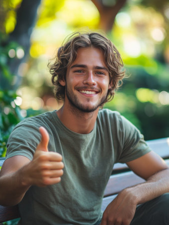Cheerful young man with wavy hair smiling and giving a thumbs-up gesture while sitting on a park bench on a sunny day.