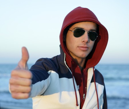 Man with sunglasses giving thumbs up sign, focus on thumb, blurred background. Positive approval