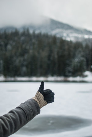 Close up shot of a womans hand doing hitchhiking sign near the country roadside during vacation trip in mountains fall forest