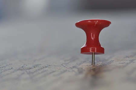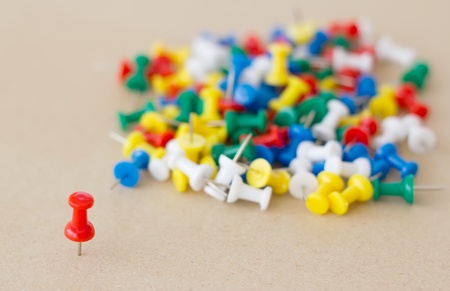 The photograph shows a close-up of several map push pins standing upright on a textured surface, possibly a map or game board. The central focus is on a vibrant red pin and a bright blue pin, flanked by pins in shades of pink, white, and yellow, all with reflective, spherical heads and slender metal shafts. The background is softly blurred, drawing attention to the colorful row of pins.