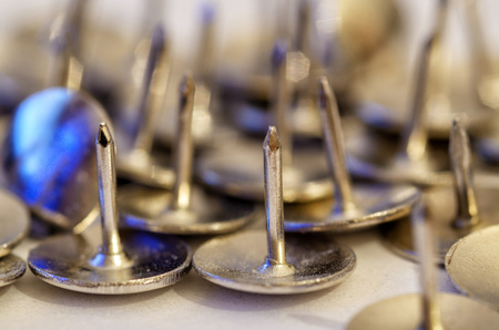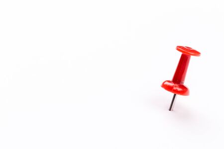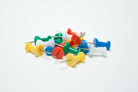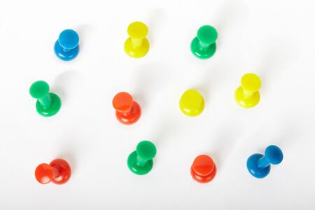 Set of push pins in different colors, with real shadows, isolated on white background - macro
