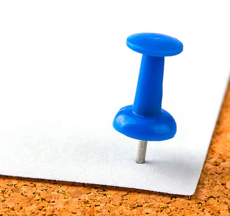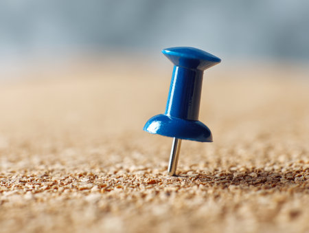A striking blue thumbtack secures a note on a textured cork surface, with a gentle bokeh background creating a focused and engaging workspace ambiance.