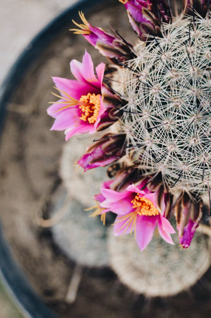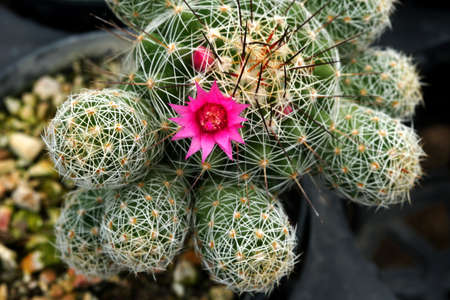 Cactus flowers, Mammillaria schiedeana with pink flower is blooming on pot, Succulent, Cacti, Cactaceae, Tree, Drought tolerant plant.