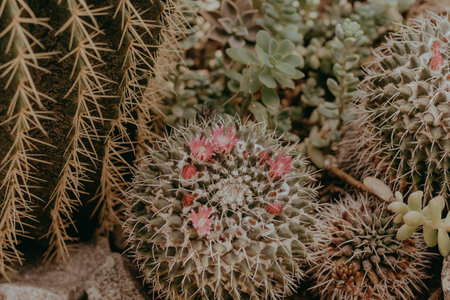 cacti in the greenhouse, the cultivation of cacti, rare cactus plants with flowers. FILN effect and shallow focus