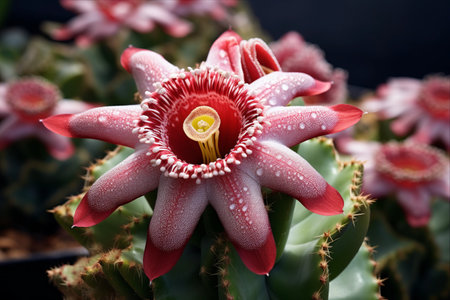 A stunning close-up of a cactus flower in full bloom, showcasing its vibrant colors and intricate details against a dark background.