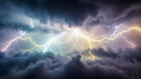 Powerful white and yellow lightning strikes illuminate dark, dramatic storm clouds, showcasing intense atmospheric energy.