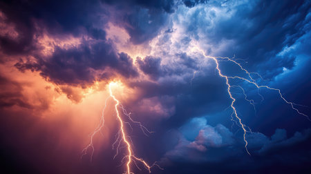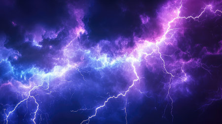 A breathtaking display of lightning illuminated against a deep purple and blue sky. This powerful natural phenomenon showcases dynamic energy and dramatic weather.