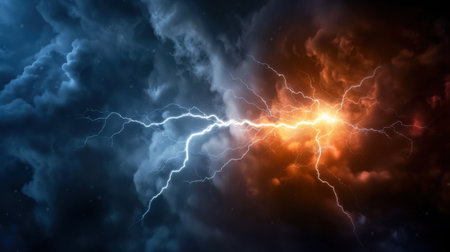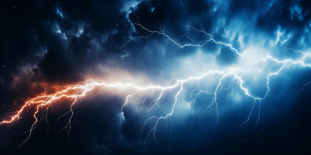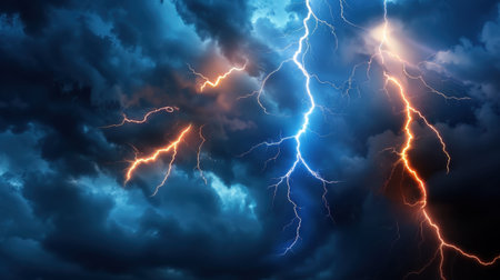 A breathtaking view of a dramatic thunderstorm showcases electrifying lightning illuminating the tumultuous clouds in contrasting shades of blue and orange.