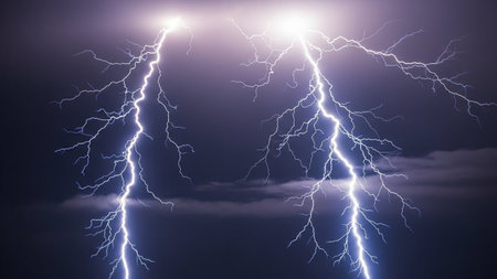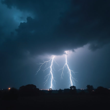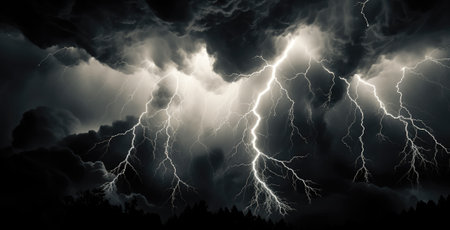 A striking display of nature's fury, featuring multiple bright lightning bolts illuminating dark storm clouds in a dramatic night sky.