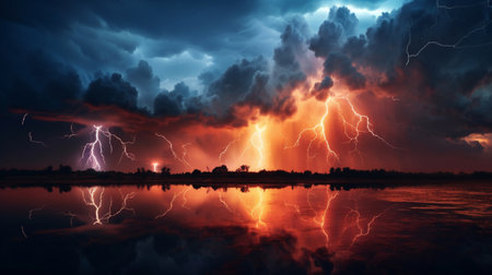 Lightning with dramatic clouds. night thunderstorm over the lake. Generative AI