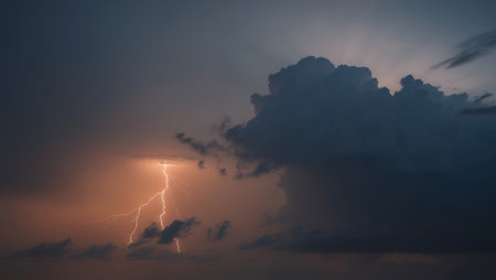 A striking image of lightning illuminating dark storm clouds at dusk, capturing the raw energy and beauty of nature during a powerful thunderstorm.