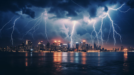 Electricity ignites city skyline during thunderstorm night generated by artificial intelligence