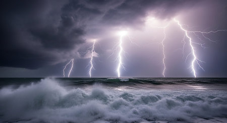 Multiple bright lightning bolts flash across a dark, stormy sky over a rough ocean with large, foamy waves.