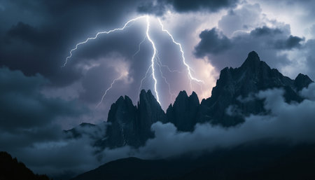 A breathtaking view of a lightning bolt striking the mountains during a thunderstorm, showcasing the raw power of nature with dark storm clouds and illuminated landscape.