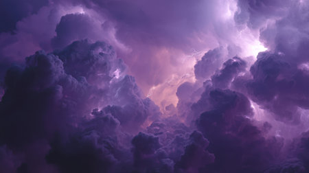 Majestic purple clouds swirl dramatically in sky, illuminated by flashes of lightning, creating captivating and intense atmosphere. scene evokes sense of wonder and awe