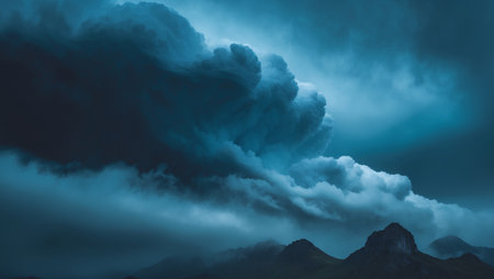 Dramatic stormy sky with dark clouds over mountain range.