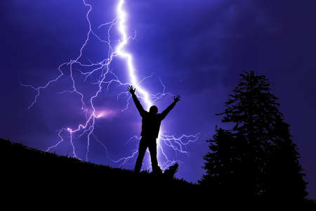 Man under the sky in night. Thunder in night. Beautifull night view.