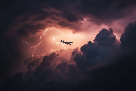 A commercial airplane flies amidst dark storm clouds, illuminated by vivid lightning strikes during a turbulent weather event.
