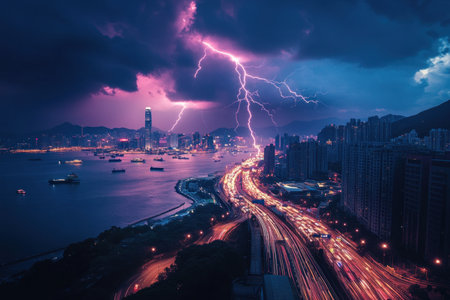 AI Generated. Dramatic lightning strikes over a cityscape during a thunderstorm at night