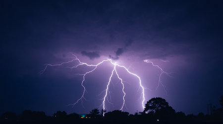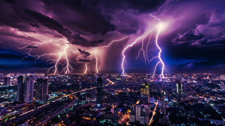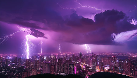The dramatic interplay of light and shadow as a series of purple lightning strikes create a spectacular show over a sleeping city.