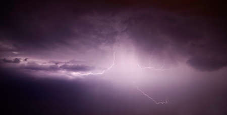 A lightning strike on the cloudy sky. Pink, lilac and purple toned image.