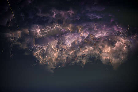 Lightning flashes in the clouds. Convoluted lightning bolts in the black clouds.