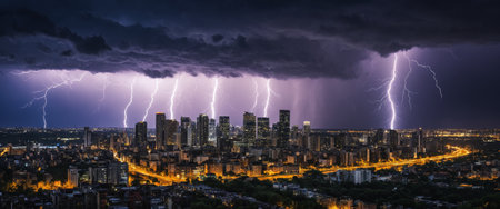 Bright lightning bolts cut through dark clouds over a vibrant city skyline during a fierce thunderstorm.
