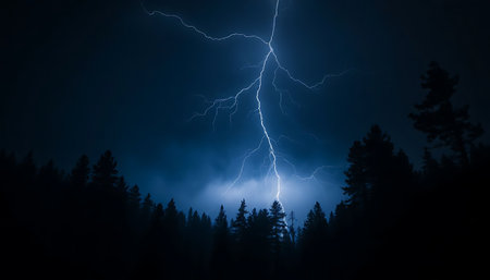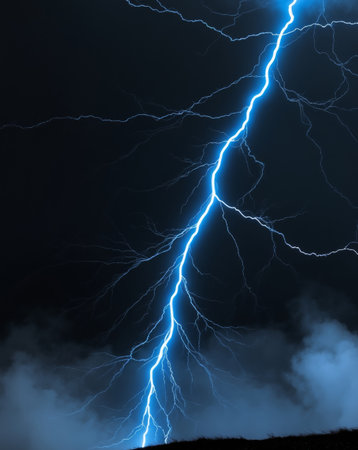 A striking view of a lightning bolt cutting through dark storm clouds in a nighttime sky, showcasing nature's power and beauty in a breathtaking display.