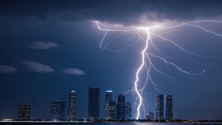 Thunderstorm illuminates city skyline with dramatic lightning strikes.