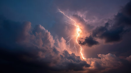 A stunning display of lightning strikes illuminates dark storm clouds, creating a dramatic and colorful sky at dusk. The natural beauty of this weather phenomenon evokes a sense of awe and wonder, perfect for capturing the intensity and power of nature.