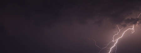 Flashes of lightning and clouds during thunderstorms at night. Panoramic photo.
